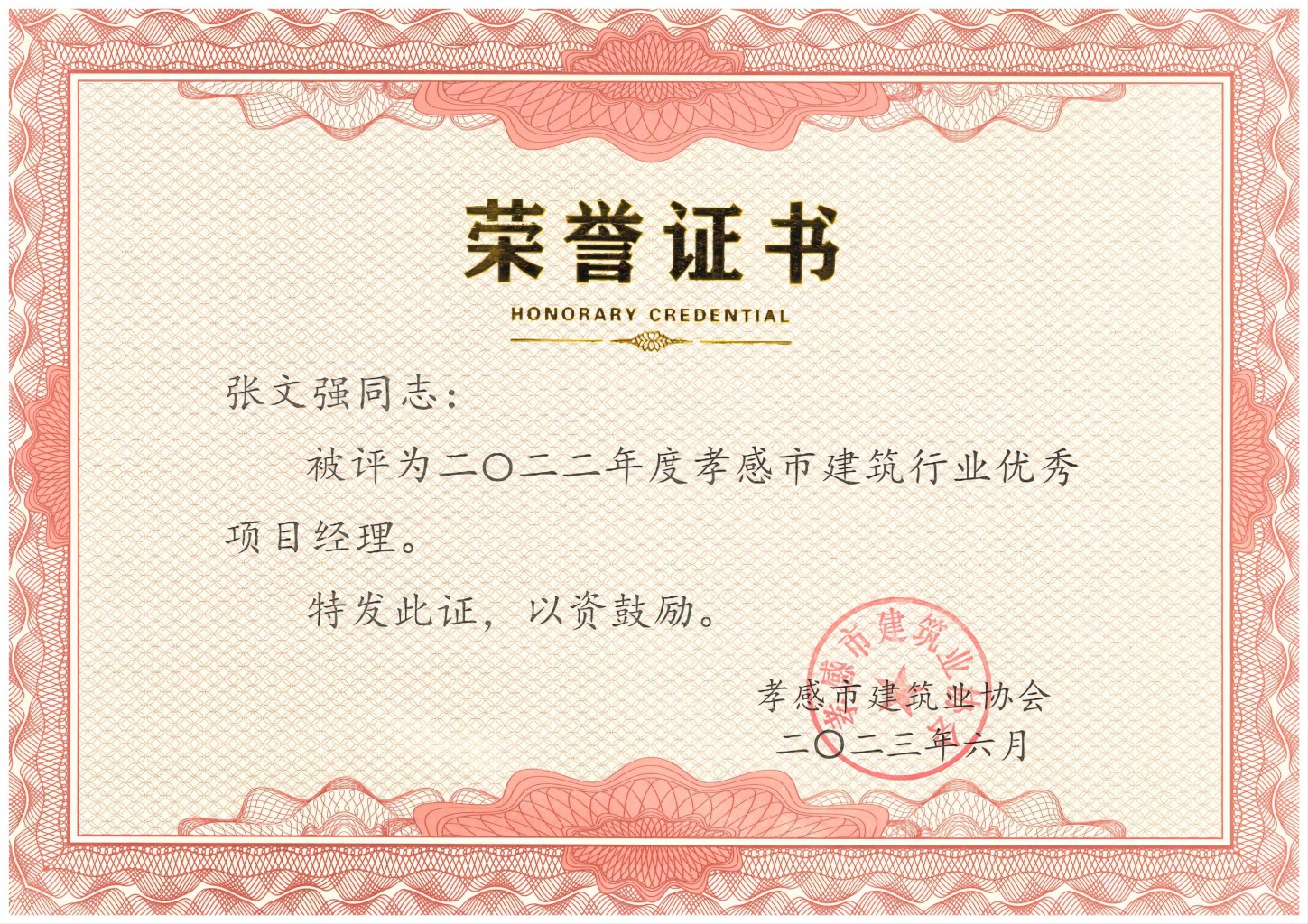 2023年度孝感市建筑行業(yè)優(yōu)秀項(xiàng)目經(jīng)理-秦銳...祝賀秦銳同志被評為2023年度孝感市建筑行業(yè)優(yōu)秀項(xiàng)目經(jīng)理...
