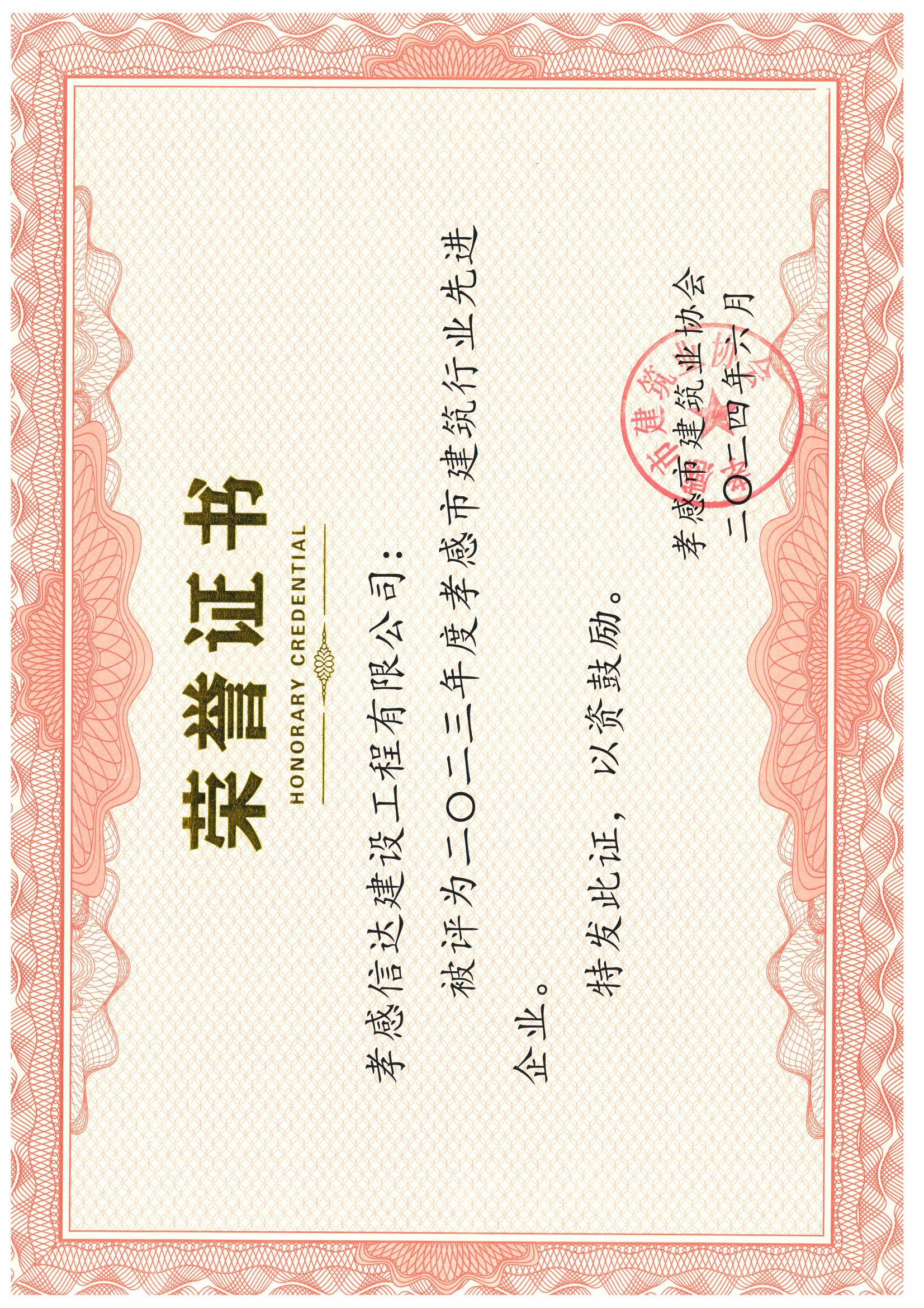 2023年度孝感市建筑行業(yè)先進(jìn)企業(yè)祝賀孝感信達(dá)建設(shè)工程有限公司榮獲2023年度孝感市建筑行業(yè)先進(jìn)企業(yè)榮譽(yù)...